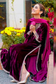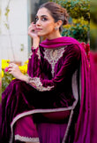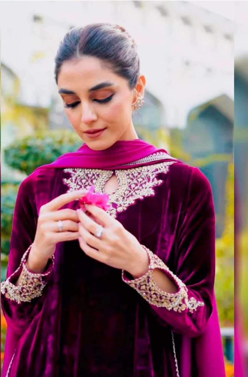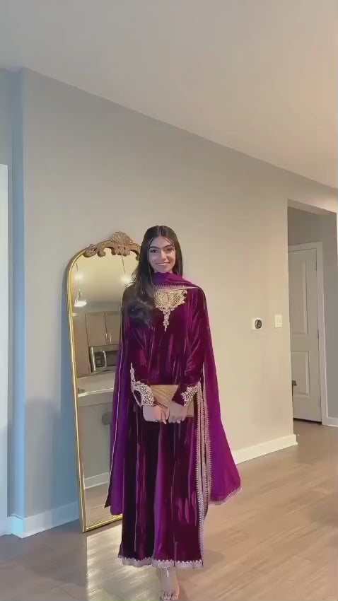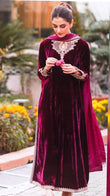 3PCS Velvet Airline shirt With Beautiful Neck, & Sleeves viscose tila Embroidered with Sequin’s Touch with Plane Chiffon Dupatta Closed with Embroidered Bordered